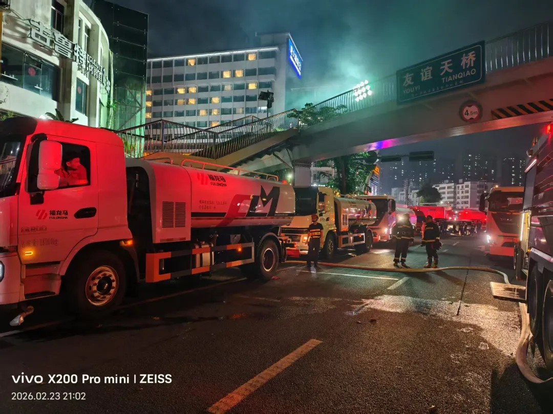 2月23日晚,解放西路個體大世界突發火情,現場(chǎng)濃煙滾滾,情況緊急。接到相關部門緊急通知後,福龍馬海口公司第一時間啓動應急響應機制,迅速調派四輛水車(chē)趕赴現場(chǎng),全力配合消防部門開展滅火救援工作。